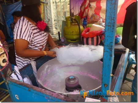 Foto di atas menampilkan seorang wanita yang sedang membuat Harum Manis aka Arum Manis ini. Makanan “kapas manis” ini tersedia dalam beberapa pilihan warna, yakni putih,abu-abu, pink, dan beberapa warna lainnya. Terlepas pewarna apa yang digunakan dan efek makanan ini di tenggorokan, saya tetap menyukainya, hehehe… Benar-benar